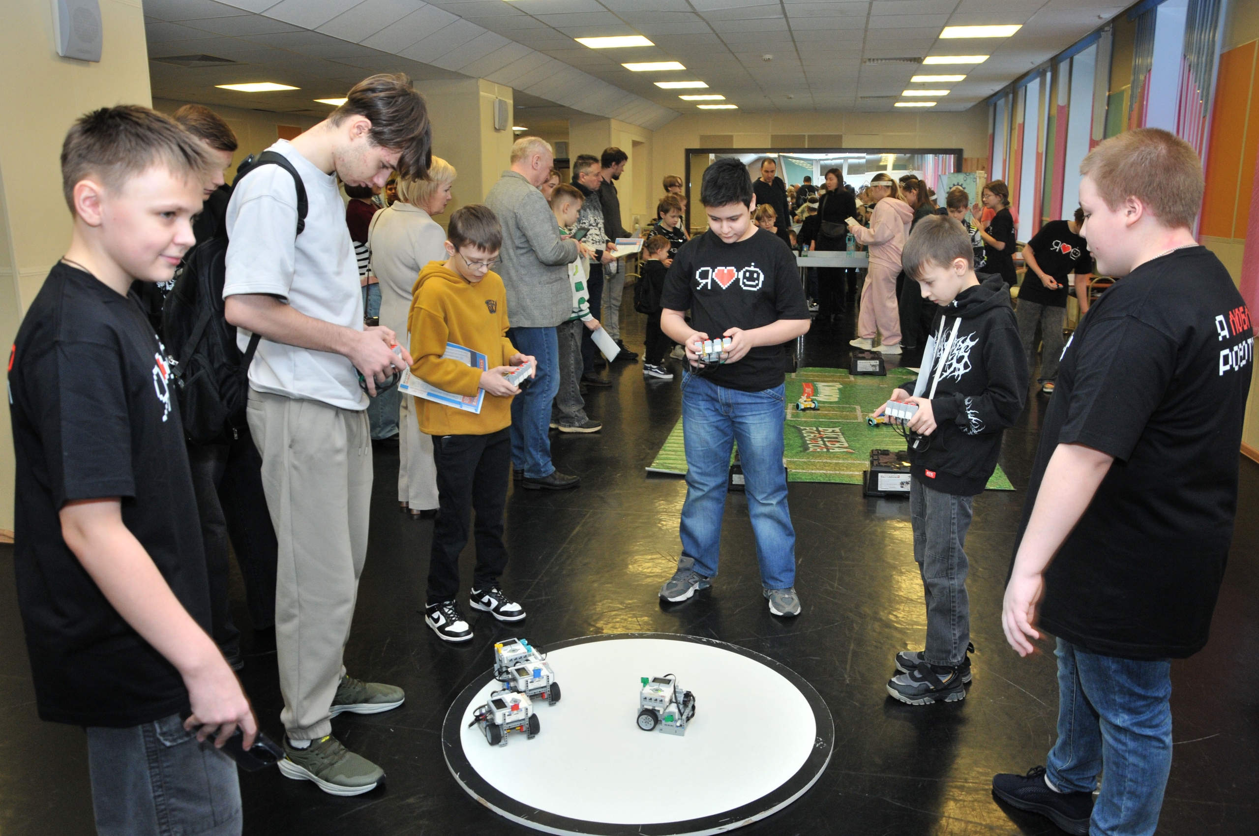 Каждый гость сам решал, что ему интереснее - роборуки или гоночная трасса, - а затем задавал вопросы по заданиям. Царила непринуждённая, живая атмосфера: никто не стоял в стороне, каждый хотел поучаствовать и попробовать силы в робототехнике.